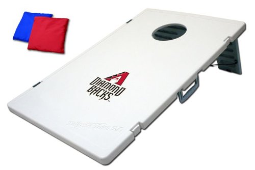 Arizona Diamondbacks plastic cornhole game. This Diamondbacks tailgate bean bag toss is a new lightweight plastic version of Tailgate Toss, the hottest outdoor game on the market. This exciting game can be enjoyed by young and old alike, packs up easily for travel and is perfect for tailgating or backyard fun. Each game includes: instructions, 8 bean bags (2 sets of 4), and 2 plastic boards that secure and lock together. Included with the game is an individual storage compartment for each bean bag. When the tailgate party goes on the road we have included a nylon carrying bag. Lightweight and sturdy, it's a must have game for the person on the go. Perfect for concerts, a day at the beach, gameday, or just in the backyard. Boards measure: 36 x 24 x 3 inches.